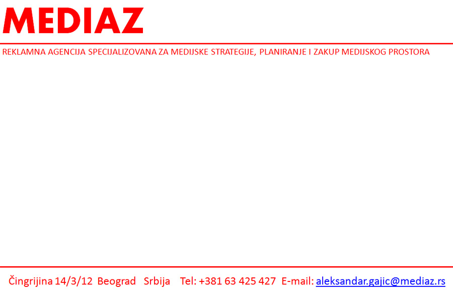 MEDIAZ - Reklamna agencija specijalizovana za medijske strategije, planiranje i zakup medijskog prostora; Beograd, Tel: 063 425 427, E-mail: aleksandar.gajic@mediaz.rs